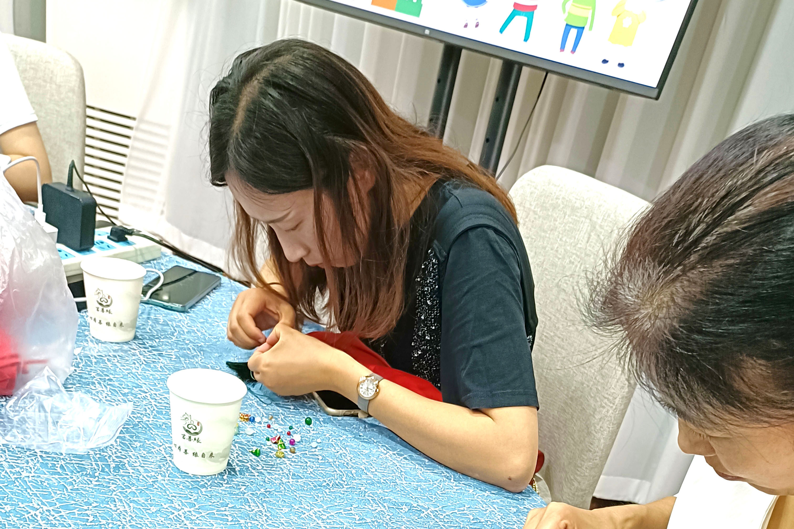 在隨后的動手制作環(huán)節(jié)中,女職員們充分發(fā)揮了自己的審美藝術,精心挑選色珠搭配,相互交流編織心得,一串串色彩斑斕、做工精致的掛件呈現(xiàn)在眼前。