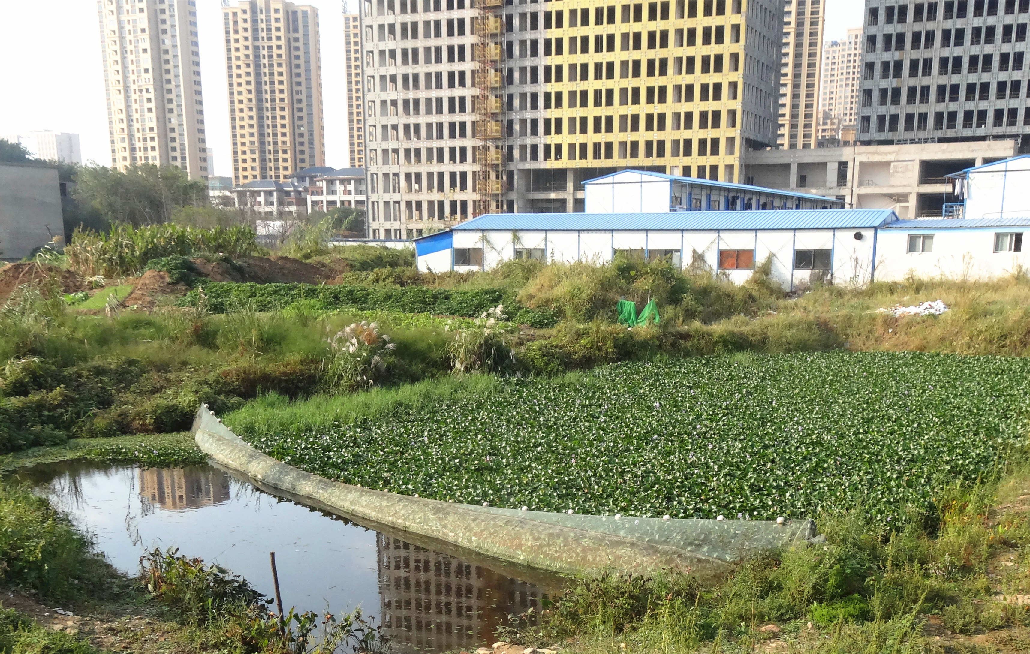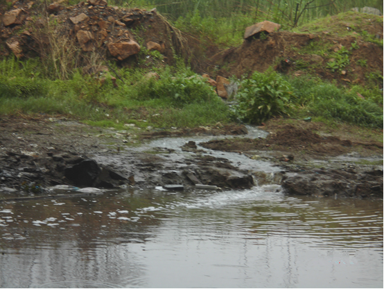 湖區(qū)北側(cè)補(bǔ)水口為湖區(qū)主要污染源,污水主要由上游魚(yú)塘水、周?chē)ㄖさ厣钗鬯⒙访?、山坡、土坡等自然雨水匯集。水中含有較多的油污、水色黑灰、水體渾濁、水質(zhì)為劣五類(lèi)。