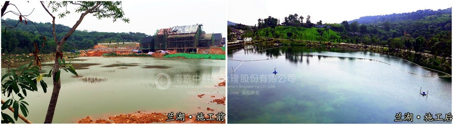 蘭湖屬于原有池塘改造,水域面積16000m2,水深1.2-3m之間,施工后,水體清澈見(jiàn)底,沉水植物生長(zhǎng)旺盛,覆蓋率達(dá)到75%以上,各項(xiàng)水質(zhì)指標(biāo)均達(dá)到Ⅲ類水標(biāo)準(zhǔn)。