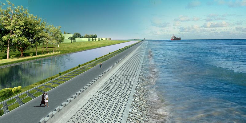 石壩消浪的缺點是投資較大,施工比較復雜,對示范試驗區(qū)水動力環(huán)境和景觀影響較大,不能保持水面完整。不過對石壩消浪加以改造,能夠比較便捷的打造親水平臺,為人們提供休閑娛樂的平臺,滿足人們的親水需求。